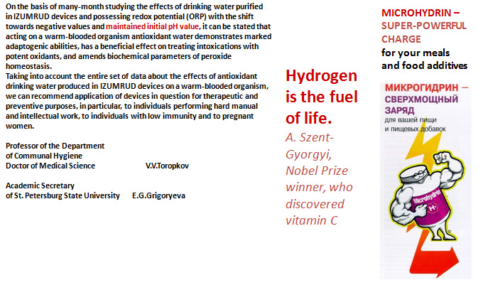 • Report on testing IZUMRUD devices for producing drinking water with antioxidant properties, approved by the Chief of Municipal Clinical Hospital No. 67 on March 13, 2003.